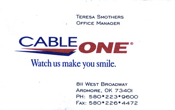 Last week I mentioned my Cableone internet and email at the old house was turned off prematurely. I went in to the local Cableone office here in Ardmore this week and talked to the office manager, Teresa Smothers, and she took care of the problem in the most professional way, even getting me a refund on the unused 2 weeks. Cableone, customer service at its best! When you got local people helping local people, that's hard to beat.