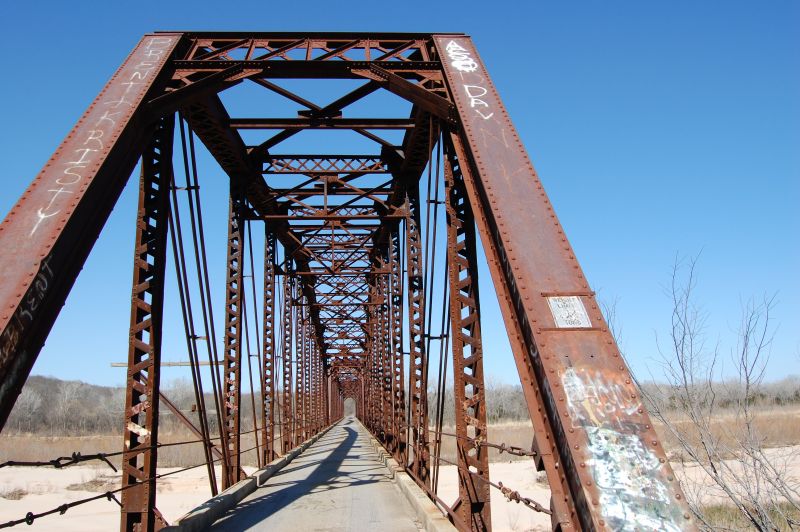 "Butch, I found out more information about the old one lane bridge North of Byars, Oklahoma and South of Waynette, Oklahoma. An elderly man told be the bridge was originally built by the Rail Road as a way for the local train to cross the South Canadian River. The rail road, now abandoned, hauled cotton bales from the Cotton Gins in the area. The locals call it the rail road bridge. You can still see sections of the abandoned track in the area. The original bridge was totally made of wood. You can still see some of the old poles in the river below. The floor of the bridge was replaced by wood after the rails were taken out. The wooden floor was set on fire by local teens, burnt, and replaced by the concrete." -Charles Smith http://www.oklahomahistory.net/ttphotos8a/ByarsBridge8a.jpghttp://www.oklahomahistory.net/ttphotos8a/ByarsBridge8b.jpg