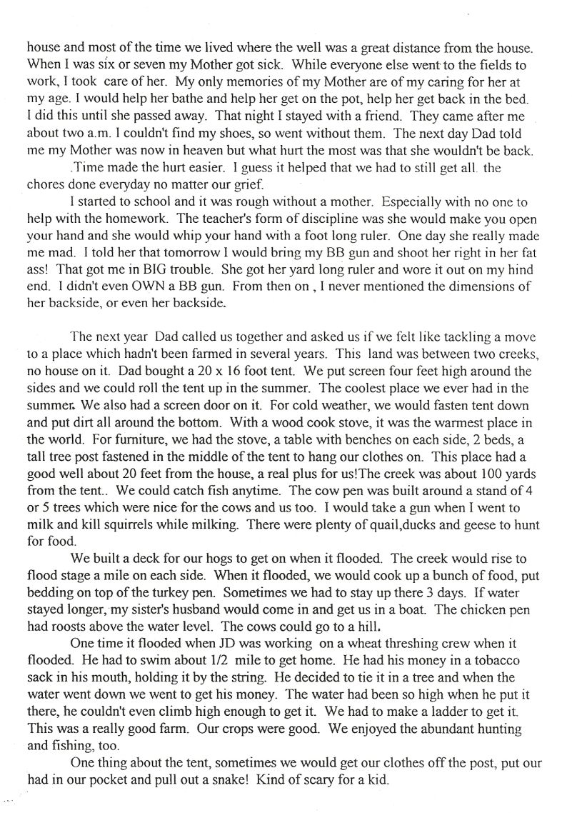 "Thanks Butch for your concern about the "CCC" Civilian Conservation Corps. I know a lot about this organization and what a wonderful thing it was for this Country. You can find out more about this at www.cccalumni.org/index.html You can click on a lot of information and also see a list of all the CCC camps in the USA. They also have a Museum in St. Louis, Mo. Plan to spend a lot of time on reading about this subject. I knew a lot of boys from Oklahoma who were in the CCC camps." LEEWAS@aol.com