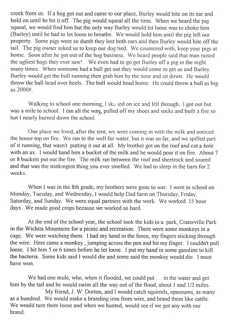 "I'm really enjoying your Southern Oklahoma History lessons. I don't mean to be picky but the fellow picking up scrap metal from Oscar, OK was called Screwdriver Bill not Scrap Metal Bill. As far as is known his real name was a mystery but he was called Bill Smith by some and rumor had it that he did have a family that he had left some place. He wore several layers of clothing year round and his pants were bib overalls, all well crusted from the oil field and ???. His money was in Bull Durham tobacco sacks and it was said every pocket had money. He wasn't known for bathing so anyone giving him a ride required that he get in the back of their pickup or "turtle hull" of the car. They said in winter he slept in an empty oil tank down in the oil field, in summer out under the stars where ever he got sleepy and if it was raining he covered with a piece of tin. He went through the trash bins of the grocery stores to glean their discarded fruit, vegetables, whatever he could salvage to eat. When he was found, at least a couple of days deceased, some of my relatives dug his grave and they buried him at night. His grave is in the Ryan Cemetery as Will Smith 1895-1963, the name "Screwdriver Bill" is included on the marker."