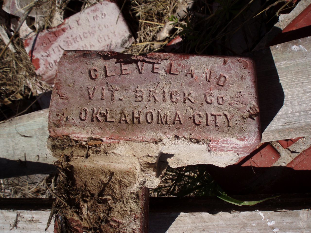 Just out of the picture above to the right is what's left of a building, and I noticed some red bricks were still there on the ground by where the front door would have been. The bricks read: CLEVELAND BRICK CO OKLAHOMA CITY.