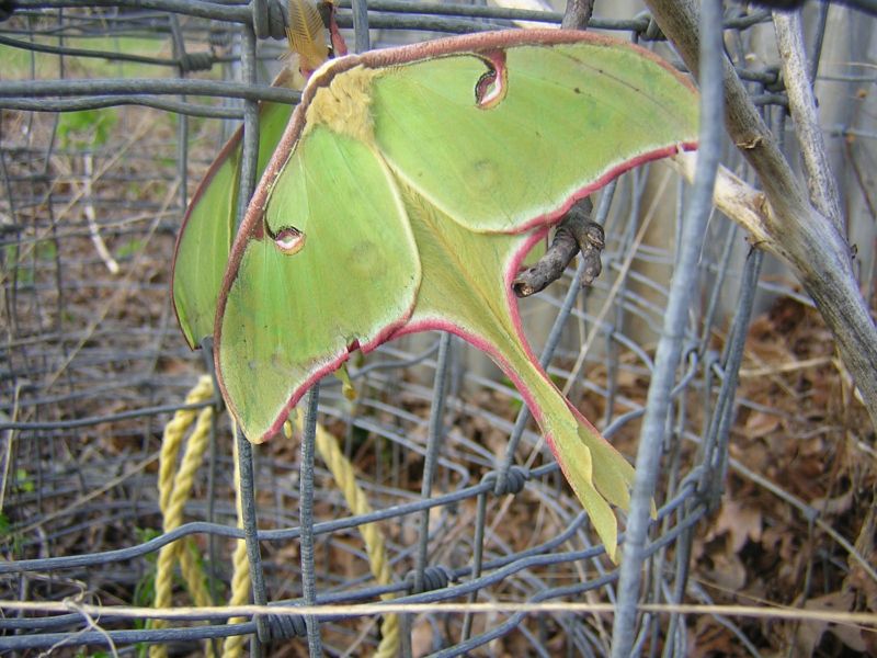 "I found these Luna Moths in SE Ardmore on a tomato cage we had sitting down by the garden. I was amazed at their size and the colors they have. They were beautiful, you can only see one as they were sitting face to face, I assume they were mating but they stayed there for several hours. I ran home and got my camera, today they were gone. I hope to find the eggs they lay (on the underneath part of a leaf). I wish I could watch for the caterpillars too hatch but who knows? I'll be watching to see if I can find them. I looked them up on the net and it is very interesting to read about them."http://www.oklahomahistory.net/ttphotos8a/LunaMoth8a.jpg