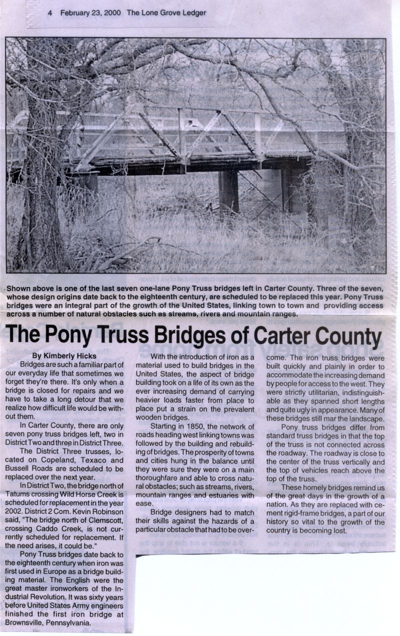 Anna Marie Wilson at Lone Grove sent me a newspaper clipping from the October 23, 2000 issue of the Lone Grove Ledger. The clipping talks about only 7 one-lane pony bridges still existed in Carter county at that time. Most of you will remember we talked 3 weeks ago about one of those bridges being removed on Concord Road.