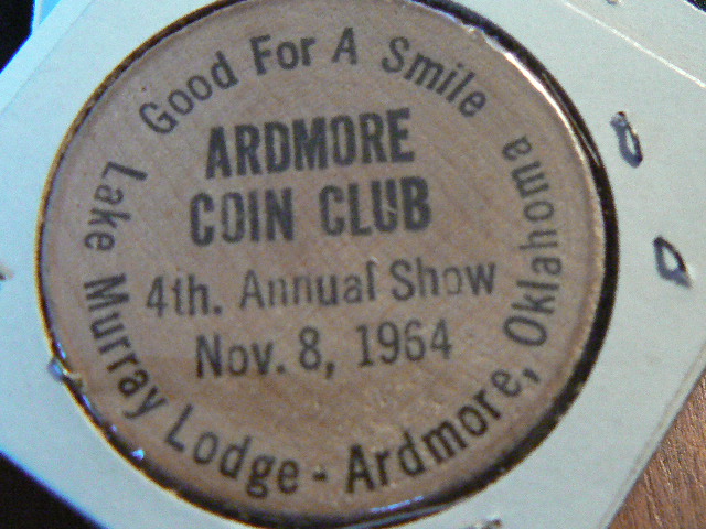 "Butch: The wooden Nickel you showed. That was a wooden nickel designed by Osh. Cameron and Rick Feiler. It was a "Give-Away" to those who attended the 4th and final Ardmore Coin show sponsored by the Ardmore Coin Club. The first show was held in 1961 and held at the Ardmore Chamber of commerce back in the meeting room, I believe the second show was also held there. The 3rd and 4th shows were held at Lake Murray Lodge in the meeting room south of the eating area. Some of the members were Ed Hannum, Katie Bevins, Ed Luke, Jim Gaskins, Ida Yaffe, Billie Zak Graybill, Gary Lynch a junior member, and 5 or 6 out of towners whose names slip me. At one time membership was about 30 adult members and about 5 junior members. There was always one or two walk-ins who just came to look and see what was going on, we also had some junior club members. The club met once a month on Tuesdays so as not to conflict with church night. A door prize was always awarded in the form of a coin or token. The club met for about 5 years and interest finally was lost. This is only the second wooden nickel I know of from Ardmore. I have heard rumors of others, One issued by Luke's Music store, One by the (Bruce Harris Sports Club), One by Tom Tipps when when he was a Senator, and another by Broadway Cab." http://www.oklahomahistory.net/ttphotos9a/ArdmoreCoinClub.jpg