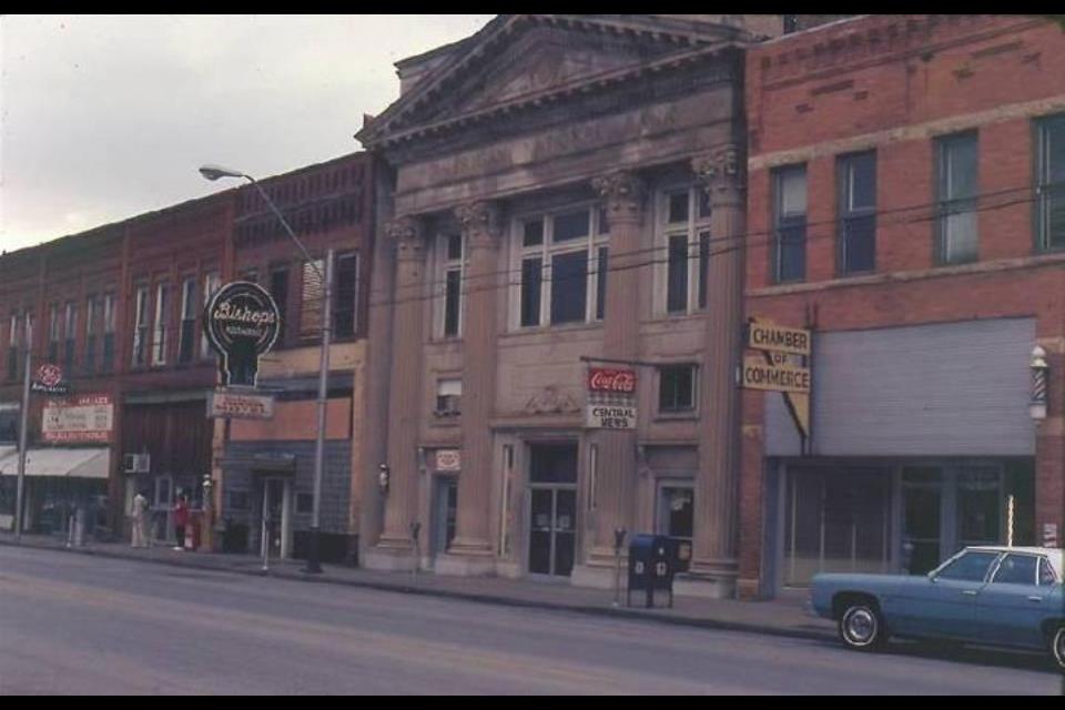 Photograph of the old Bishop's Restaurant in Okmulgee, Oklahoma before the entire block burned.
