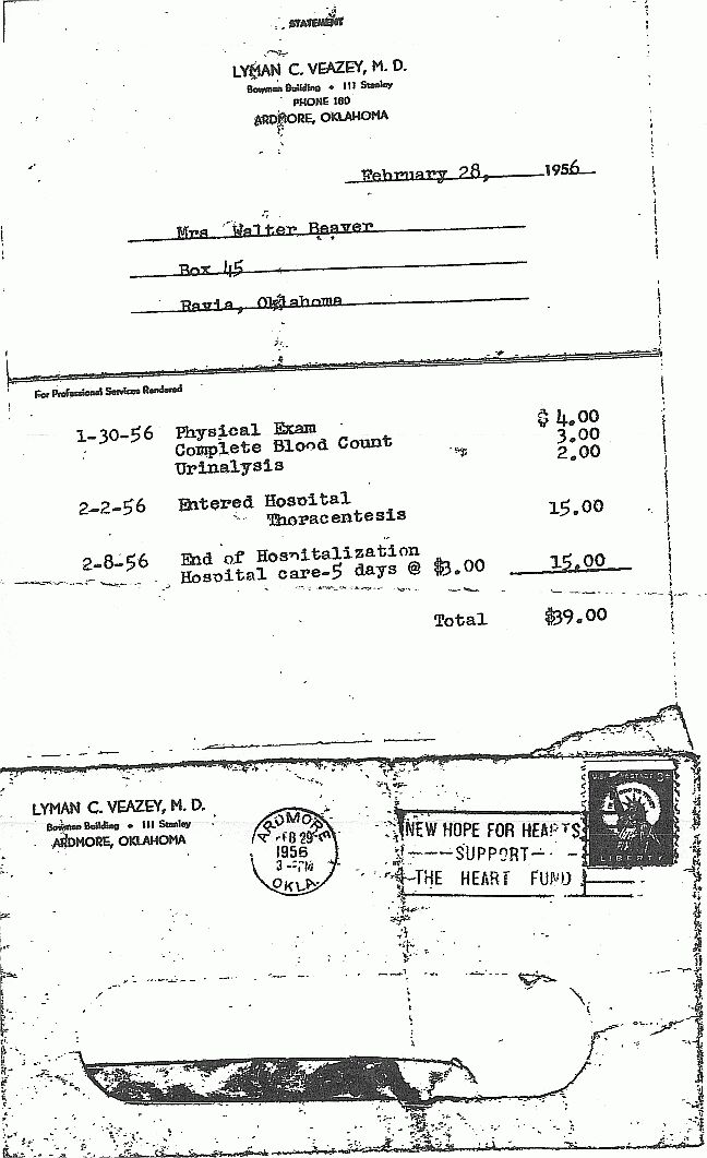 This week I received an surprise letter in the mail! It was from Ruby Billingsley in Lone Grove, Oklahoma. Enclosed was a copy of her grandmother's doctor's charges back in 1956. Her five day hospital stay was at $3.00 a day for doctor visits! Reminds me of 1970 when I worked for the ambulance service and we charged $22.50 to take you to the hospital. Prices have sure changed over the years. Ruby's grandmother's doctor was Lyman Veazey, M.D. (1904-1988) whose office was in the Bowman Building on Stanley SW in 1956. Phone 180.