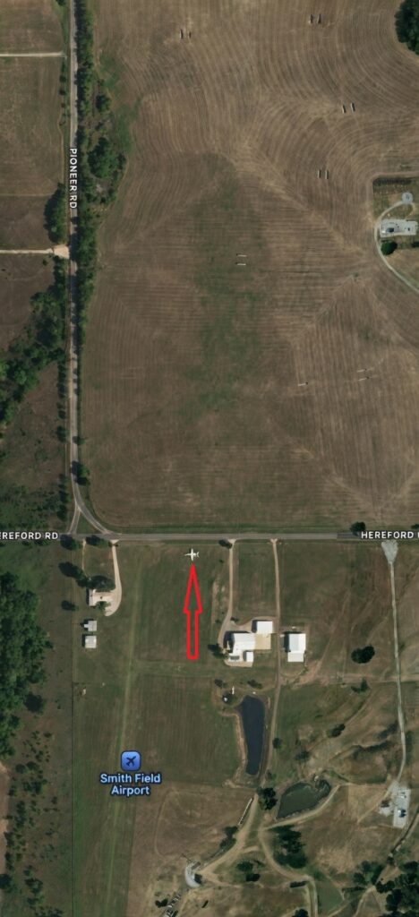 The plane is located where Pioneer Road and Hereford Road intersects on Hereford Road on the Smith Airfield west of Springer.