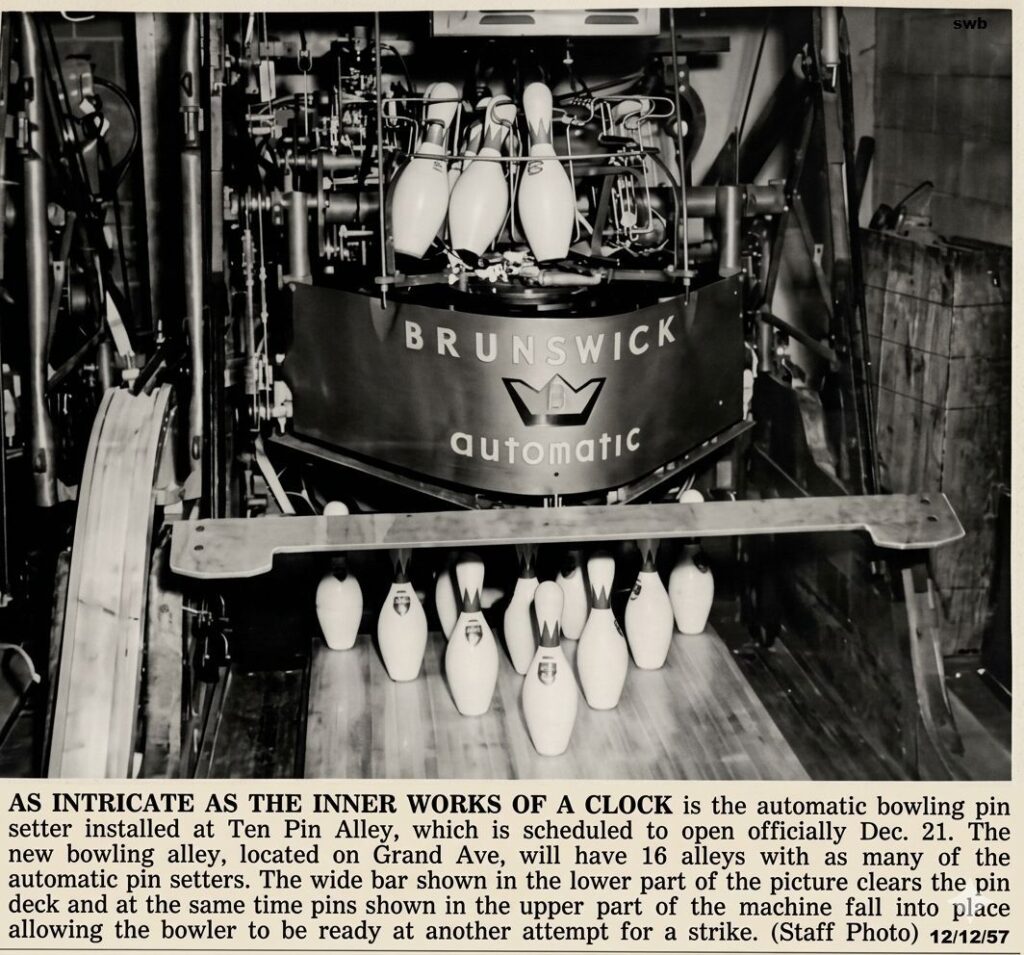 Ten Pin Bowling Alley on Grand opened for business on December 12, 1957. The photo below was so blurry you could hardly make out the word Brunswick. I sent it through AI and what a change in sharpness and readability.