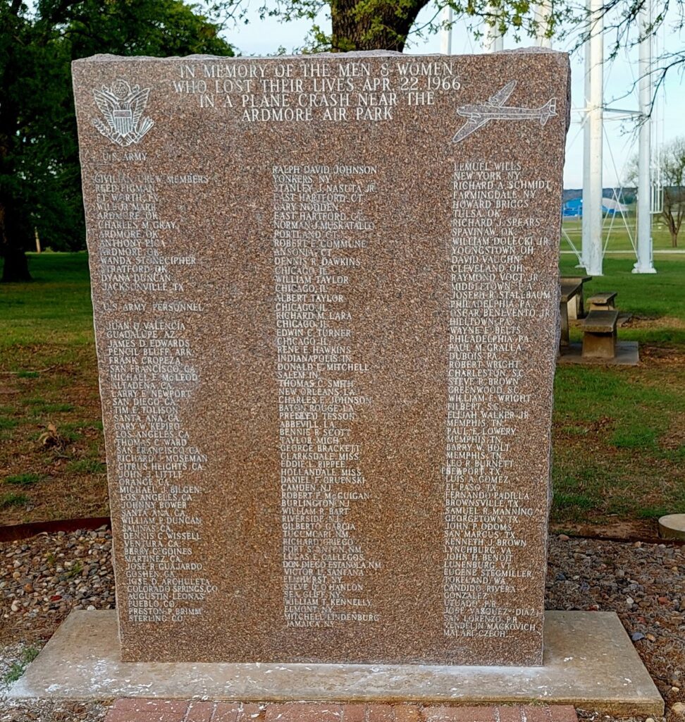 The big granite memorial at the Ardmore Airpark that lists Army personnel who died in the 1966 plane crash has been needing the lettering restored and readable again for some time. Thanks to Col Arnold Moncrief and his military buddies the job has been completed. He contacted Bill Main of Memorial Art Company on 12th NW. Bill did a great job at making the names readable again.