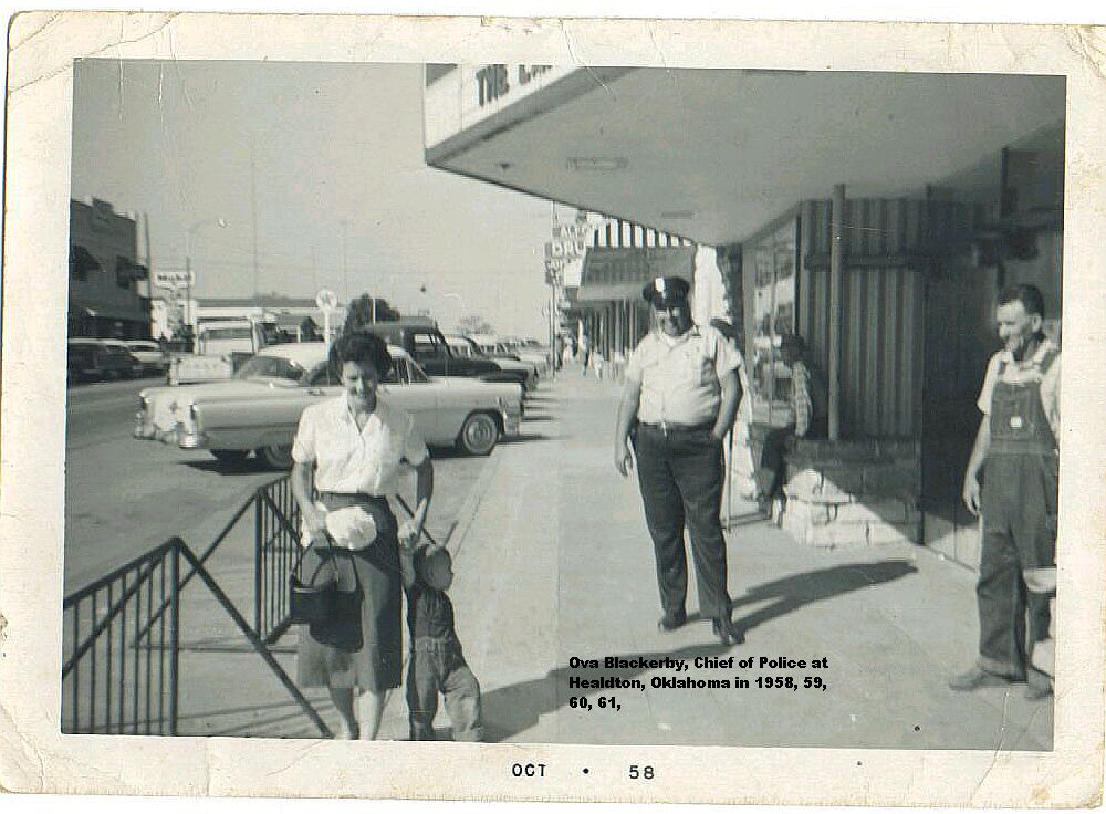 "This is a picture of Ova Blackerby. He was Chief of Police in Healdton in 1958, 59, 60, 61,? He was night watchman before that. My name is Kathy Correia, he was my uncle. Uncle Ova died June 3, 1984 in Bakersfield, CA. His wife Gladys Blackerby, sons James, Ronnie, daughters Brenda, Joyce (twins), Barbara, still reside in Bakersfield, CA. I'm his niece and i live in Riverside, ca. He has two brothers still alive. Roy of Pruitt City, OK, Tommy of Lake Jackson, TX, one sister, Dean Clary of Yukon, Ok. It was a very sad day in my life when my uncle died. I used to visit him a lot. I may have other pictures of Healdton. If you would like I'll look." http://www.OklahomaHistory.net/ttphotos/blackerby.jpg