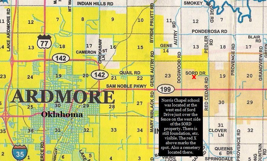 Norris Chapel School inquiry. I have drew a map where the Norris Chapel school was located years ago. It is right against the west fence of SORDS landfill east of Ardmore.... on the west side of the SORDS property line. The school is on private property. The easiest way to get to it is go to the west end of SORDS Road and look on the west side of their fence.
