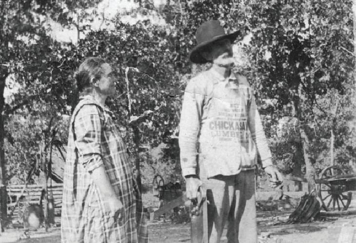 "Butch, The mention of the Chickasaw Lumber Company brought to mind this photo from an old family photo album. Since we are unsure of the identity of the man and woman, although they are almost certainly family, I refer to it as the picture of the Chickasaw Lumber carpenter's apron. I believe that the photo was taken prior to 1920 in Carter County, North Texas or Arkansas. The album it was in belonged to my great-aunt Tommie Payne who was the postmaster in Lone Grove for about thirty years." -Chuck Stallcuphttp://www.oklahomahistory.net/ttphotos9a/ChickasawLumberApron.jpg